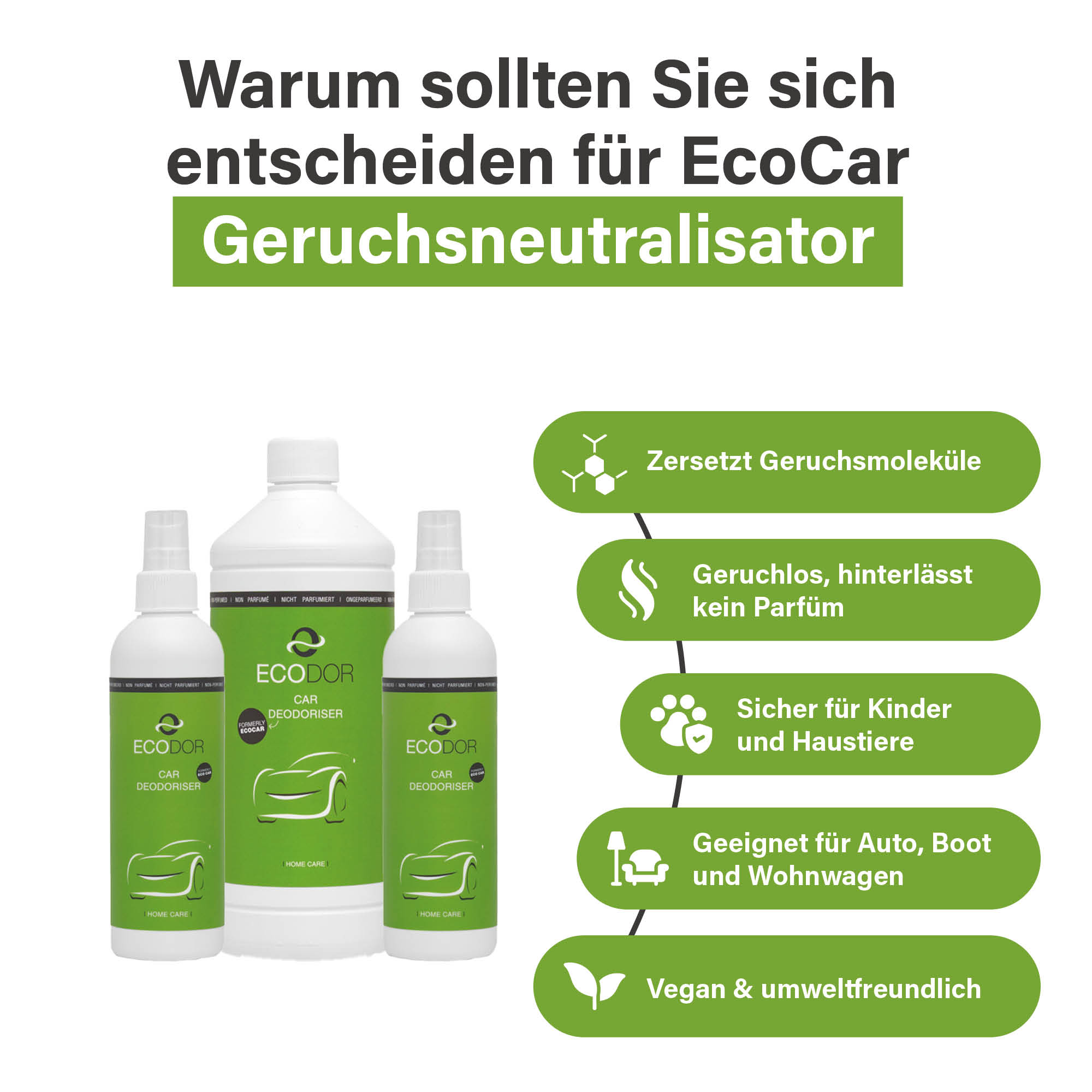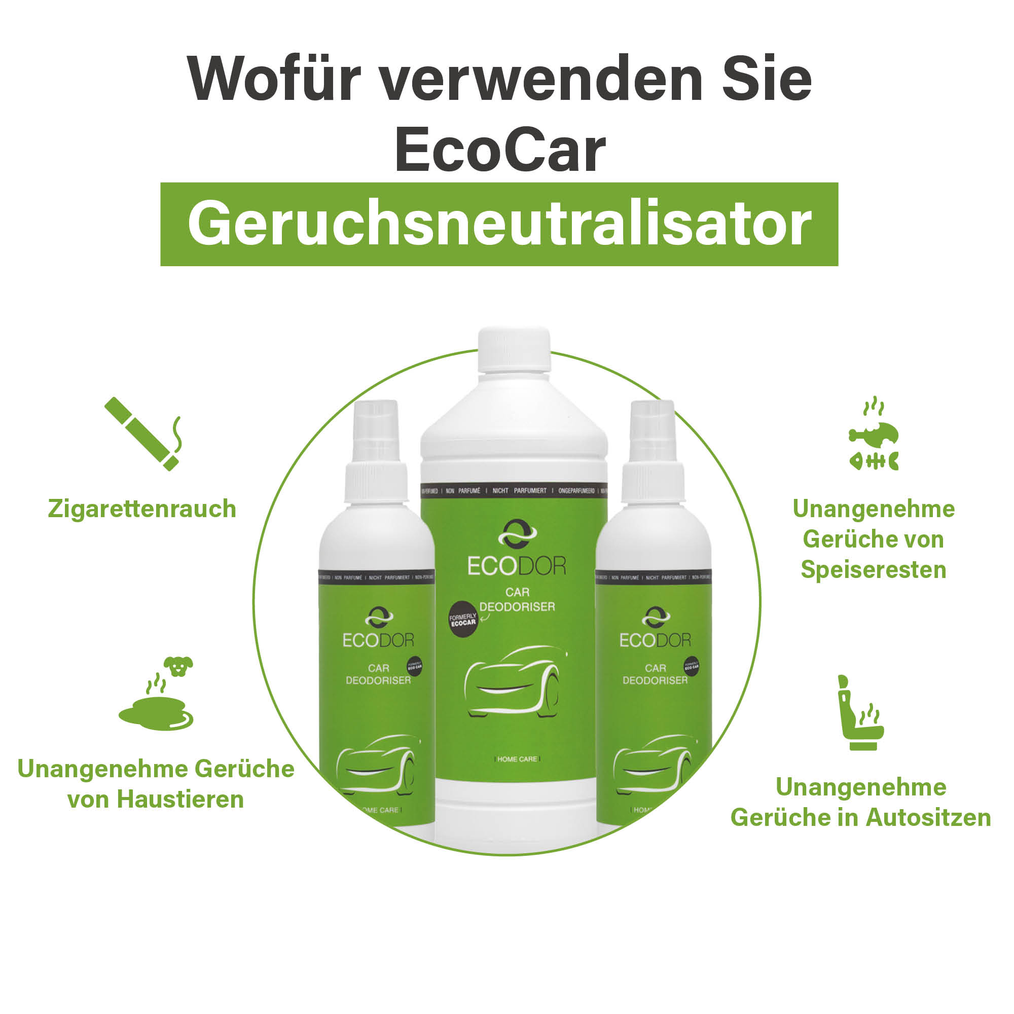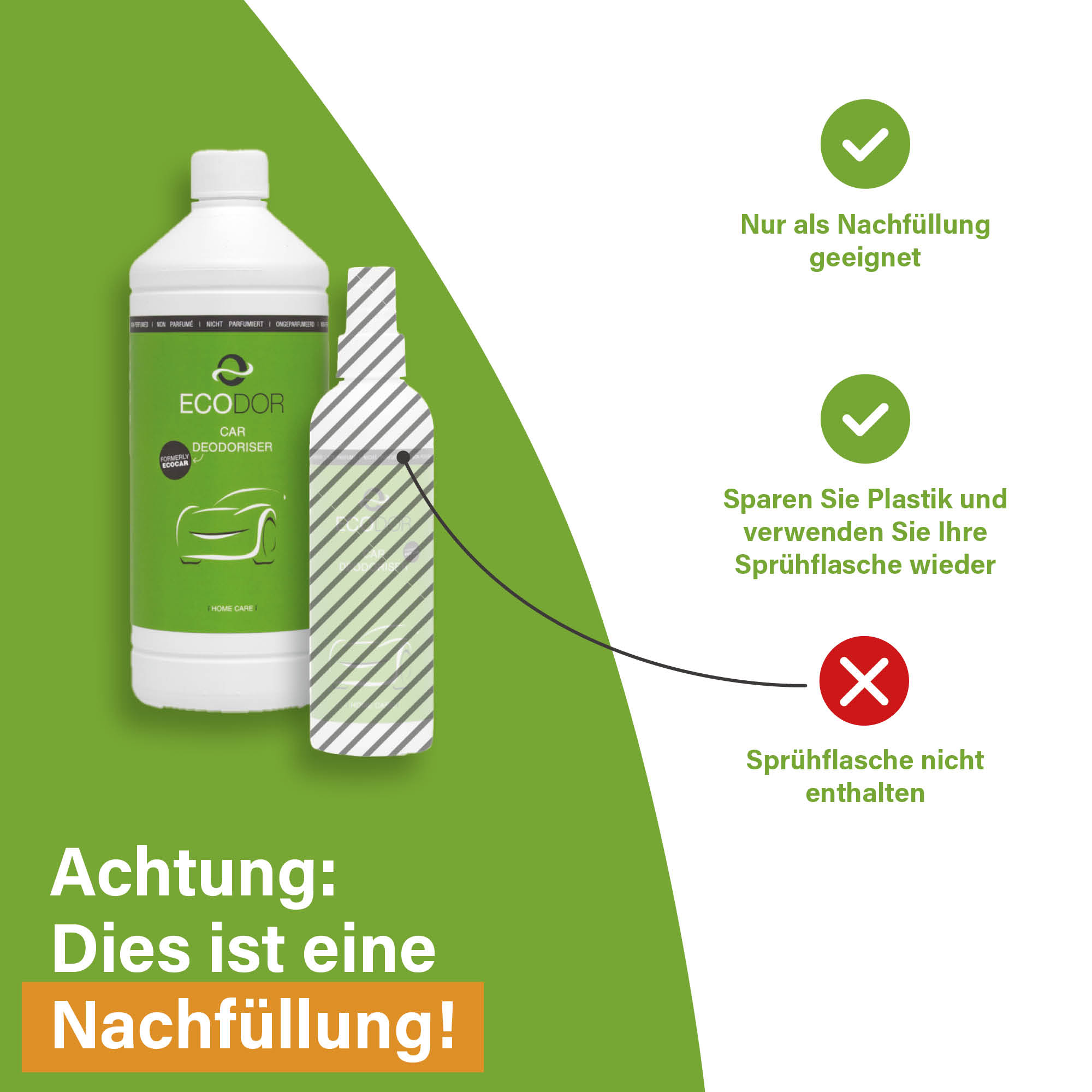 EcoCar Lufterfrischer. Preiswerte 1 Liter EcoCar Nachfüllflasche zum Auffüllen der Flakonflaschen. EcoCar baut die Geruchsmoleküle in der Luft auf natürliche Weise ab, wodurch ein unangenehmer Geruch einfach verschwindet und nicht nur von einem Duftstoff überdeckt wird. EcoCar eignet sich ausgezeichnet u. a. zum Entfernen von Gerüchen im Auto, von Essens- und Haustiergerüchen sowie von kaltem Rauch.